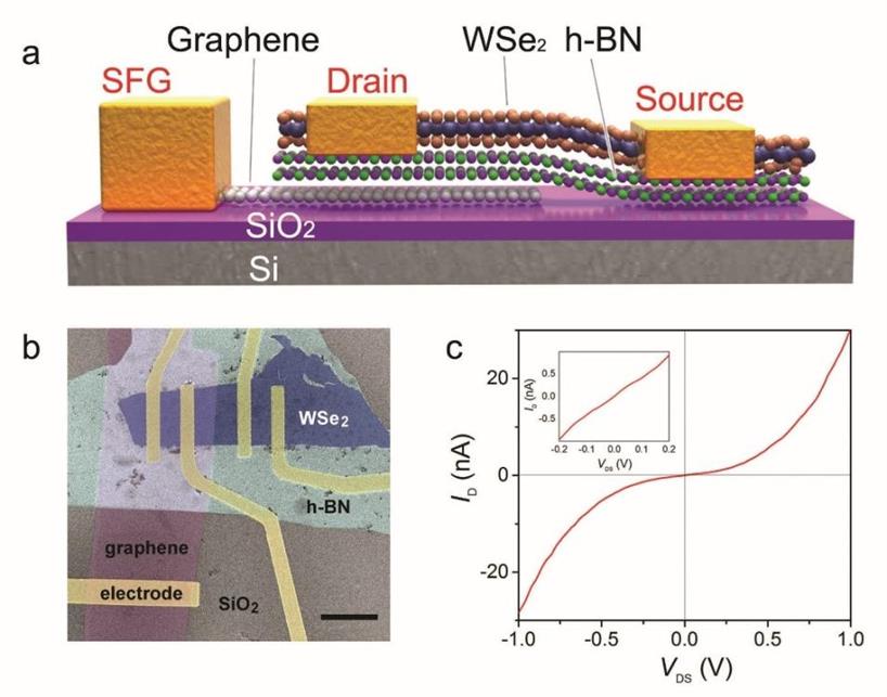 近年来,二维晶体相关理论和技术的持续进步为半导体器件的突破性进展提供了基础。基于对二维晶体载流子调控机理的深入研究,张增星团队创造性的提出并制备了一种基于二维晶体的半浮栅场效应晶体管(SFG-FET)新型结构,构建出具有逻辑调控和信息存储功能的新型p-n结。与传统的半导体p-n结不同,在这种新型p-n结里,可以通过调控脉冲电压,实现二维晶体在p-n结与非p-n结之间的逻辑变化;而且这种结构还具有非易失性可存储功能,存储寿命远远超过10年,达到了可实用化半导体器件的水平。相关结果可用于发展新型电子和光电子器件,同时也为发展便携式柔性透明器件提供了材料基础。