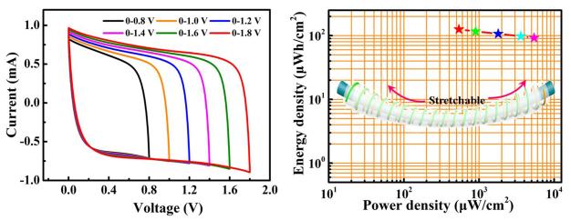 接着他们又以二氧化锰/导电聚合物/氧化碳纳米纤维为正极,花瓣状二硫化钼/碳纳米管纤维为负极,构建了稳定工作电压达1.8 V的可拉伸纤维状非对称超级电容器,所制备超级电容器不仅具有高的能量密度 (125 μWh/cm2),还具有良好的可拉伸性,相关研究成果以“Stretchable Fiber-Shaped Asymmetric Supercapacitors with Ultrahigh Energy Density”为题在线发表在《Nano Energy》上。