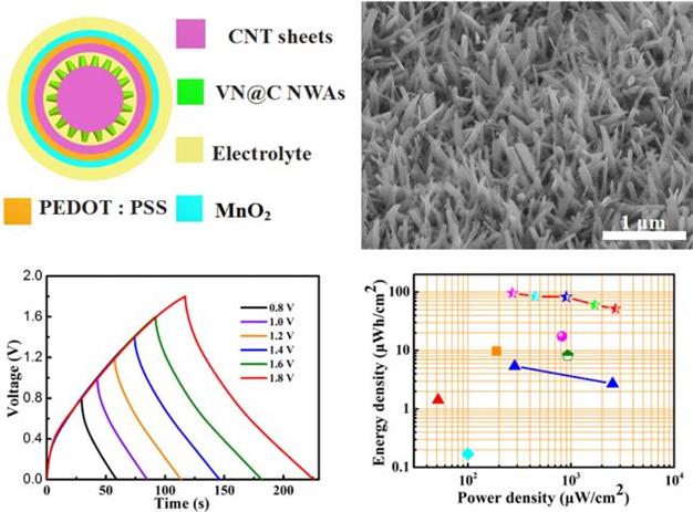 该团队在碳纳米管纤维表面生长出具有取向性的氮化钒纳米线阵列,并以此为负极(核电极),二氧化锰/导电聚合物/取向碳纳米管为正极(壳层),制备出了具有1.8 V工作电压的同轴结构全固态纤维状非对称超级电容器。所制备超级电容器面积电容高达217 mF/cm2,最大能量密度可达96 μWh/cm2,相关研究成果以“Wrapping Aligned Carbon Nanotube Composite Sheets around Vanadium Nitride Nanowire Arrays for Asymmetric Coaxial Fiber-Shaped Supercapacitors with Ultrahigh Energy Density”为题发表在《Nano Letters》(2017, 17(4): 2719-2726)。该工作可为设计新型纤维状非对称超级电容器提供新的思路。