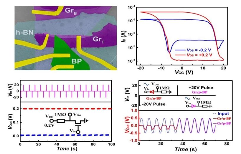 肖特基结二极管的输运过程主要由多数载流子控制,它们在高频电子和光电子器件中有着重要应用。该课题组利用双极性二维晶体黑磷,通过和金属性的石墨烯结合来作为肖特基结沟道,进一步通过耦合石墨烯浮栅结构,设计了一种浮栅场效应肖特基结晶体管(FG-FESBT)的新型结构,构建出具有逻辑调控和信息存储功能的新型肖特基结二极管。通过调制控制栅的电压,该器件表现出双极性特征,可以存储在p型或n型肖特基结状态,存储时间超过10年,并可以实现快速转变,具有可编程特征。相关结果可望用于发展新型电子和光电子器件,同时也为发展便携式柔性透明器件提供了可能。
