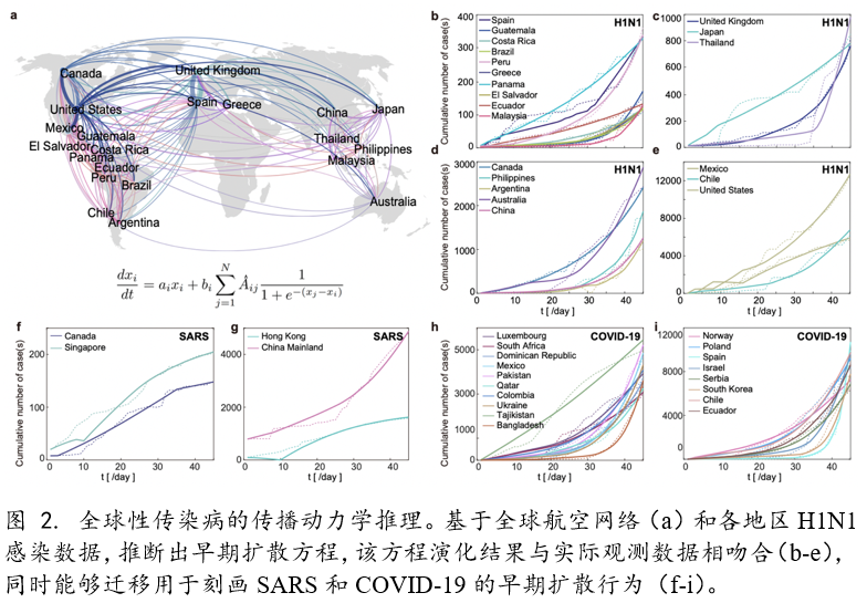 该算法框架具有很强的鲁棒性,能够对抗观测数据中的缺失边、伪连边、观测噪声、关联噪声、内禀随机性等不确定性,在宏观行为同步较强时仍然能够实现推理。与以往针对单个体或少量个体的智能推理方法相比,该研究提出的方法能够在更复杂、非正交项空间中进行搜索,而且在针对数据不确定性的5个模型系统测试中均表现更优。该框架也被应用于推理全球性传染病的传播动力学(图2),算法基于H1N1传播数据,发现了用于描述早期传播过程的简洁的常微分方程,该方程同时能够刻画SARS和COVID-19的早期传播行为,验证了方法的有效性和普适性。