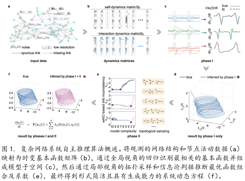 以往的研究着重于单节点或少量节点动态方程的推理,对于包含大量节点的复杂网络系统而言这个问题面临更多挑战。例如,不仅节点活动数据含有噪声而且网络结构数据可能不准确,节点的自身动力学可能具有异质性,系统宏观行为可能会掩盖节点之间动态耦合的微观机制。为了克服这些挑战,在该研究中作者融合全局和局部两个视角,提出了新的复杂系统自主推理框架(图1),该算法能够高效、准确地从观测数据中推理出隐藏的网络动力学方程,为自动化地发现复杂系统的底层原理提供了有效的新途径。