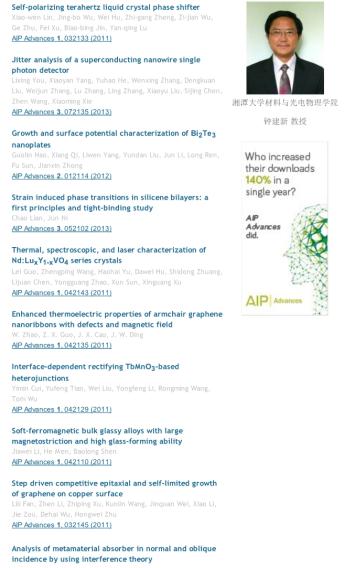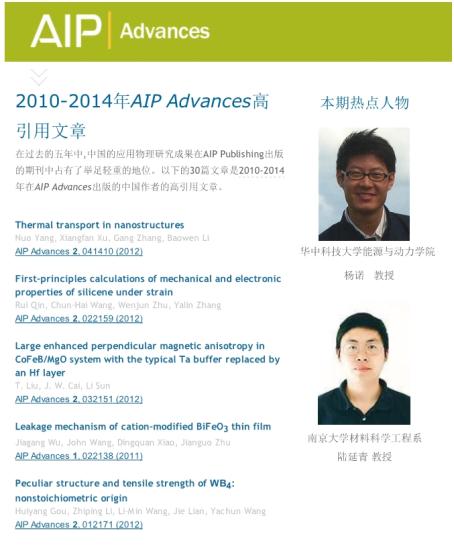 在过去的五年中,中国的应用物理研究成果在AIP Publishing出版的期刊中占有了举足轻重的地位。在2010-2014年中国作者在AIP Advances出版的30篇高引用文章中,漫蛙漫画 声子学与热能科学中心徐象繁研究员等共同发表的“Thermal transport in nanostructures” 位居前列。