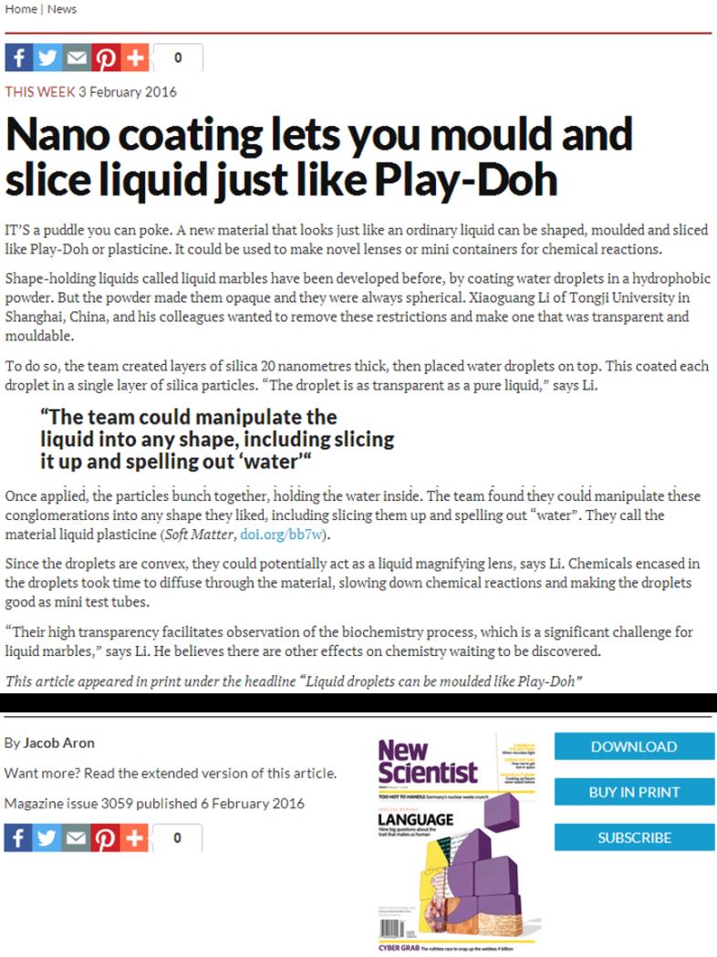 近日,漫蛙漫画 沈军课题组以漫蛙漫画 上海特殊人工微结构材料与技术重点实验室为第一单位在软物质领域的Top期刊《Soft Matter》上发表一篇文章,“Liquid plasticine: controlled deformation and recovery of droplets with interfacial nanoparticle jamming, Soft Matter, 2016, 12, 1655”, 被选为该杂志第12卷第6期的封面,并引起了著名学术评论媒体的关注,先后被《New Scientist》杂志和Discovery频道报导。