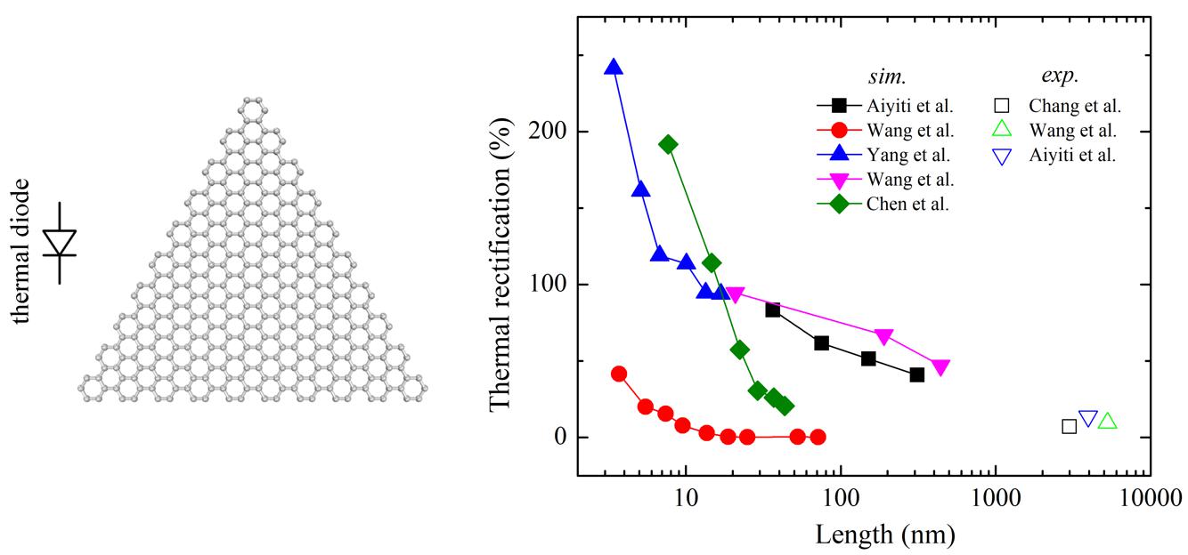 图3. 低维材料中尺寸依赖的热整流效率。数据分别来自Aiyiti et al.29,Wang et al.30,Yang et al.31,Wang et al.32,Chen et al.33,Chang et al.34和 Wang et al.32。
