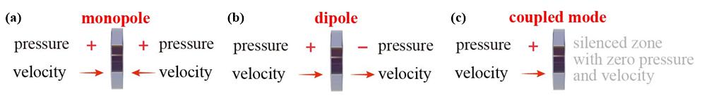 3. 基于系统表面响应模态简并的隔声机理示意图:(a)隔声单元的单极子响应模态,(b)隔声单元的偶极子响应模态;(c)等强度单偶极子响应的模态简并,即强隔声状态。