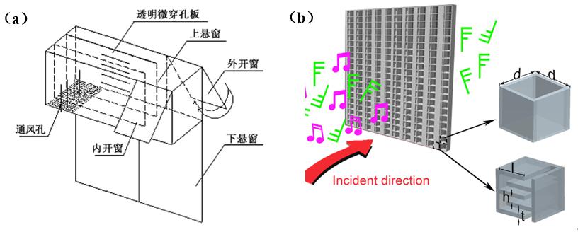 1. (a) 传统通风隔声窗示意图; (b) 超构设计的通风隔声窗示意图。