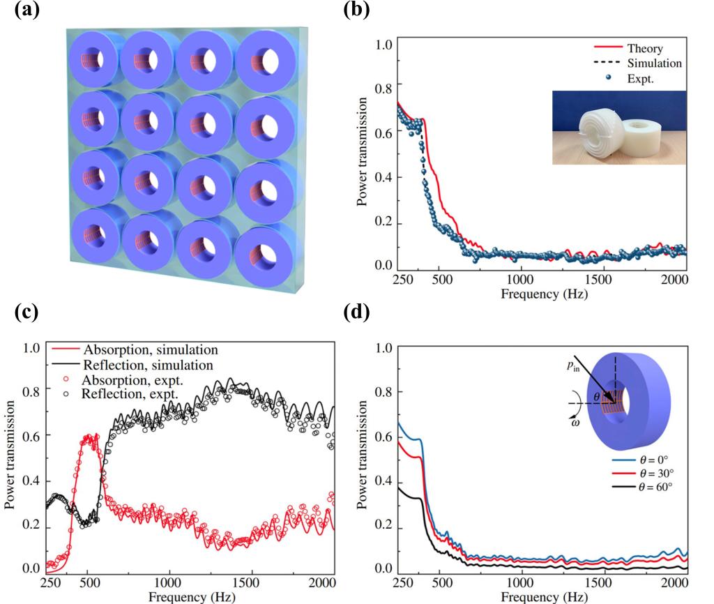 [Phys. Rev. Applied 13, 044028 (2020)]。为了在有效通风的前提下实现超宽带隔声,研究团队进一步结合耗散机理和干涉机理(下图c),提出了具有复合功能的超构声学单元,实现了多角度入射条件下的具备自然通风的宽带隔声窗设计(下图d),在两类机理协同作用下,其工作频率范围达到两个倍频程以上(650-2000