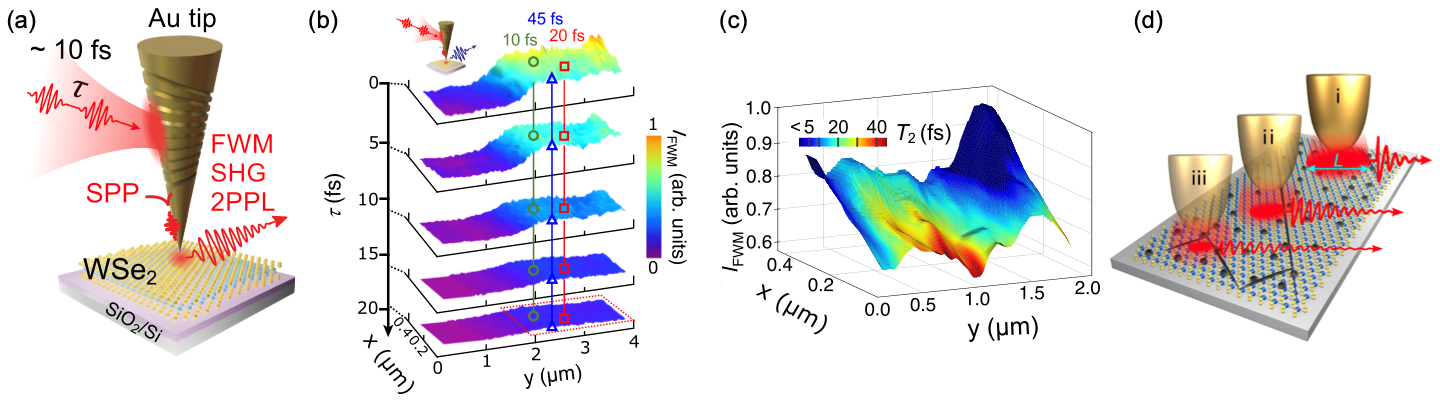 图1: a,超快纳米光学显微装置示意图。b,超快纳米尺度四波混频成像。c,退相干时间与四波混频强度之间的反相关行为。d,基于空间相干性和非局域敏感特性的唯象理论模型。