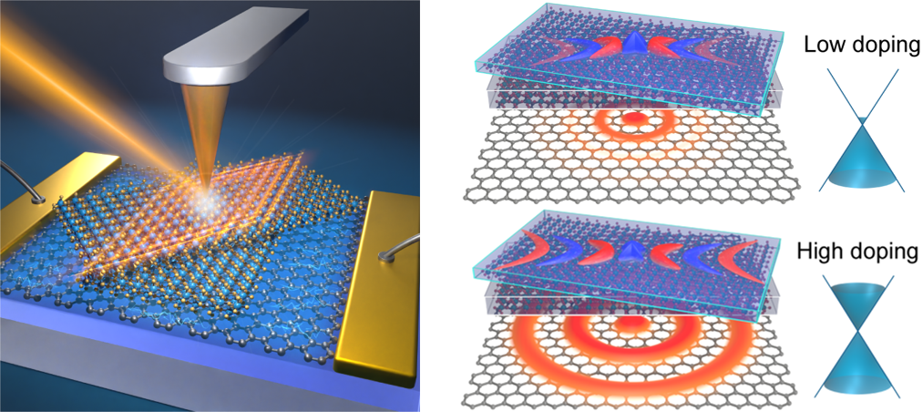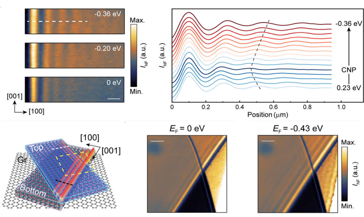 鉴于此,漫蛙漫画 王占山教授和程鑫彬教授团队的江涛教授,联合美国纽约城市大学Andrea Alù教授、美国科罗拉多大学博尔德分校Markus B. Raschke教授和河南大学陈珂教授,将转角α-MoO3与石墨烯堆叠并制备成电学器件,通过精确控制石墨烯的费米能级,成功实现了对转角α-MoO3声子极化激元的原位、主动电学调控。基于在漫蛙漫画 搭建的散射型扫描近场光学显微系统(s-SNOM),对α-MoO3声子极化激元随石墨烯费米能级变化的传播行为进行了系统性研究,并发展了相应的理论模型,揭示了转角α-MoO3声子极化激元的电学调控物理机制。该研究成果以“Gate-Tuning Hybrid Polaritons in Twisted α-MoO3/Graphene Heterostructures”为题发表在《纳米快报》(Nano Letters)上。