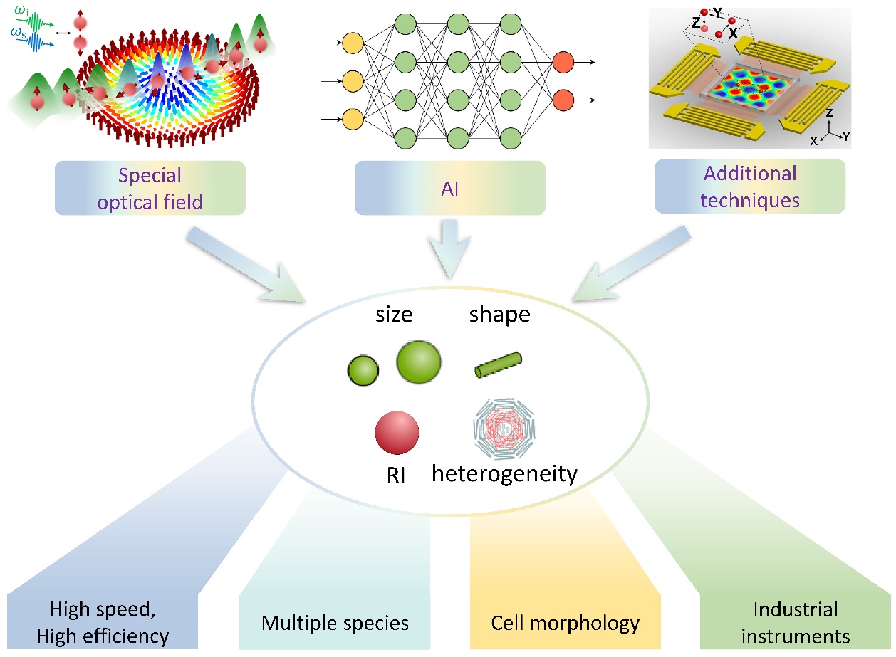 尽管光学分选技术已广泛应用于多个领域,但仍面临分选速度慢、高浓度样品处理困难等挑战。未来,通过设计特殊光场、优化AI算法及集成辅助技术,有望突破光学分选方法的极限,实现更快、更高效的多物种分选和细胞形态研究(图2)。预计未来将涌现更多纳米级精度光学分选设备,广泛部署于研究所和医院,快速处理药物分子、病毒和外泌体等样品。