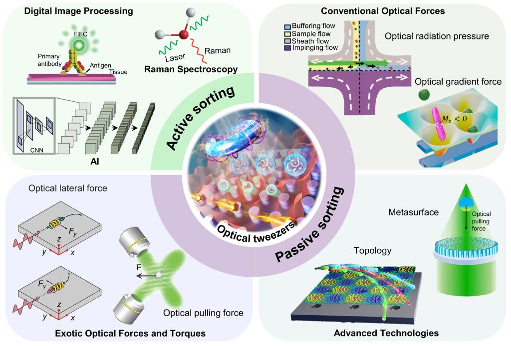 颗粒分选在化学催化、药物释放等许多领域具有重要意义。纳米颗粒的尺寸和形状差异直接影响其性能,尤其是手性药物的毒性与其结构密切相关。光学分选技术通过整合光力(如光辐射压力、光梯度力、光牵引力和光横向力)与微流体、人工智能(AI)、成像、免疫测定等技术,显著提升了分选效率和精度。该综述将光学分选技术分为主动和被动两类(图1),并详细分析了其原理以及未来研究的方向,为研究人员提供了有价值的研究思路。