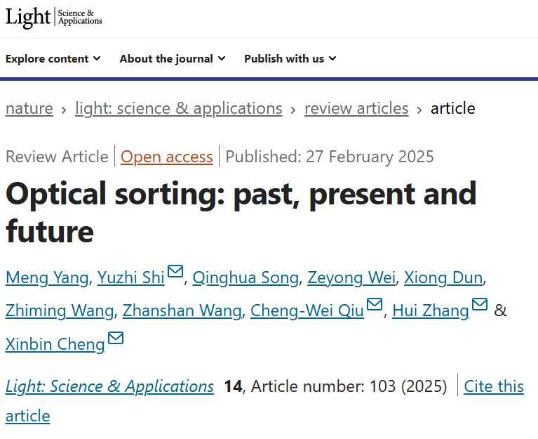 王占山教授、程鑫彬教授团队的施宇智教授和张卉教授联合新加坡国立大学仇成伟教授,共同深入探讨并梳理了近些年来各种光学分选尤其是光镊分选技术的发展脉络、基本原理以及重要研究进展,并紧密把握前沿方向,深入探讨了光镊及新型光学效应与技术在分选领域的应用潜力。相关研究成果以“Optical sorting: past, present and future”为题发表于光学期刊《光:科学与应用》(Light: Science & Applications)。