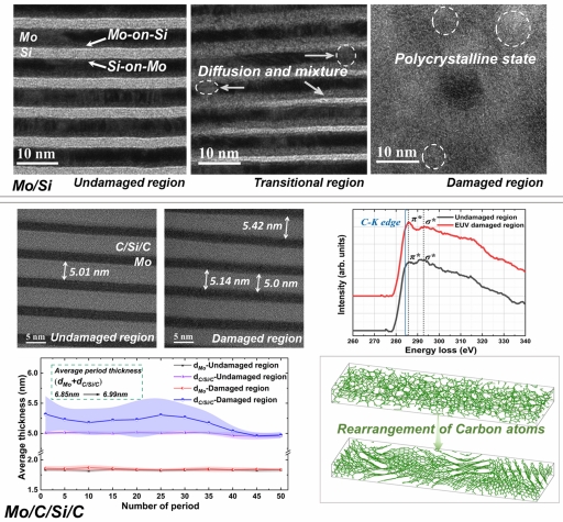 通过全方位表征测试,研究表明Mo/Si多层膜的EUV损伤归因于Mo和Si原子之间的扩散反应,生成钼硅化物(h-MoSi₂、t-Mo₅Si₃)导致多层膜结构塌缩,从而产生光滑的坑状损伤形貌。然而,Mo/C/Si/C多层膜的损伤行为与碳层的非均匀石墨化有关,导致辐照区C/Si/C层出现随机分布的膨胀,产生了凸起状形貌。基于分子动力学模拟,研究阐明了非均匀膨胀为无定型态碳膜在EUV辐照诱导下发生了石墨化,随机堆叠的石墨结构形成了非均匀膨胀(图2)。