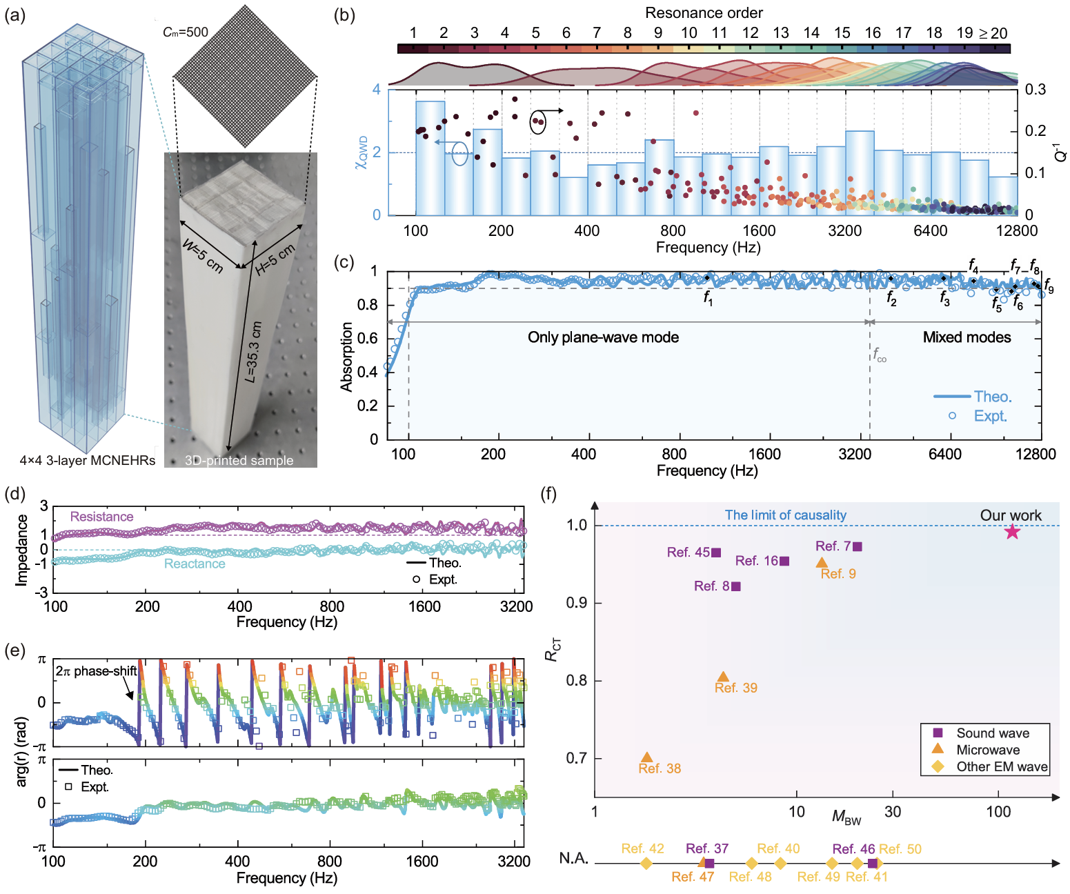 该研究通过16个串联亥姆霍兹共振器与超薄金属丝网(厚度0.05mm)精确调控共振模式特性。其中,亥姆霍兹共振器提供基础共振模式,金属丝网则解耦调控本征损耗,抑制阻抗振荡,实现全频段阻抗匹配。实验结果表明,该吸声体在100H至12800Hz频段内平均吸收系数约0.944,且厚度接近因果约束所需的最小厚度[图2]。