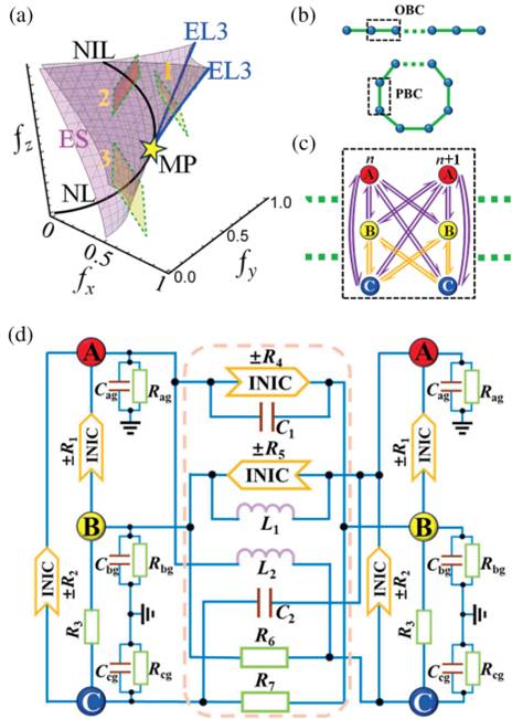 研究团队通过精心设计的非互易拓扑电路,在实验中成功观测到这类新型边缘态。实验电路精确模拟了基于燕尾突变奇点构造的一维无带隙系统,验证了边缘态在能带闭合情况下的稳定性(图2b-d)。该研究在理论层面将拓扑保护的概念拓展至无带隙拓扑相位,为非厄米体系中的拓扑现象研究开辟了新方向。在学科交叉方面,这项工作创新性地融合了突变理论、代数拓扑和非厄米物理等多个物理学与数学的前沿领域,为后续相关研究奠定了重要基础。