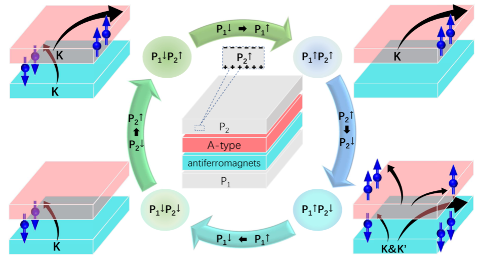 图1、选择性翻转铁电极化实现多种霍尔效应调控示意图
