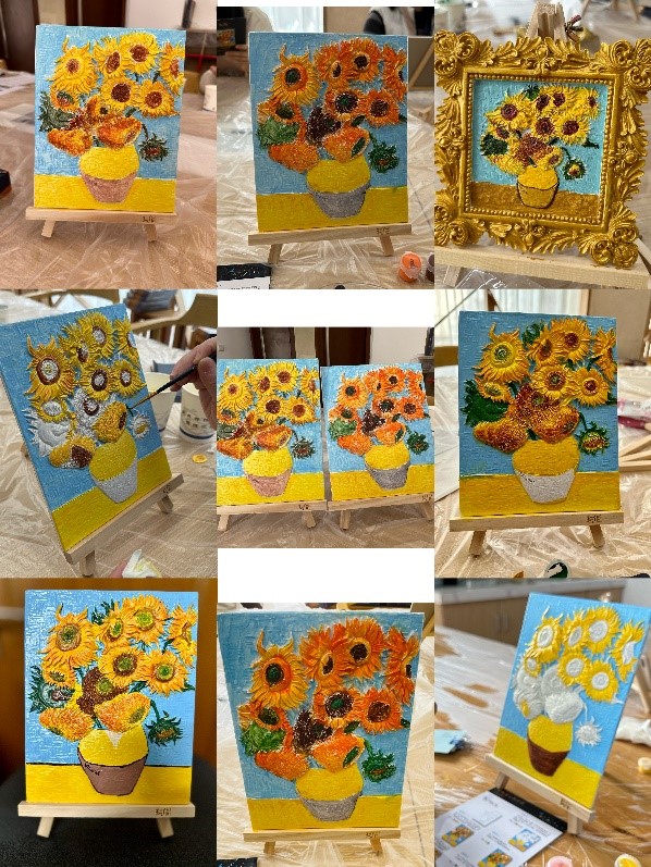 组织全院女教职工开展立体浮雕手绘油画活动。活动以手绘油画的形式,涂鸦梵高的向日葵、星空,莫奈的日出、丰收等经典名画。本次活动让女老师们在工作之余愉悦精神、放松心情,增强了学院女教职工们的交流和凝聚力,丰富了女教职工们的工作和文化生活。