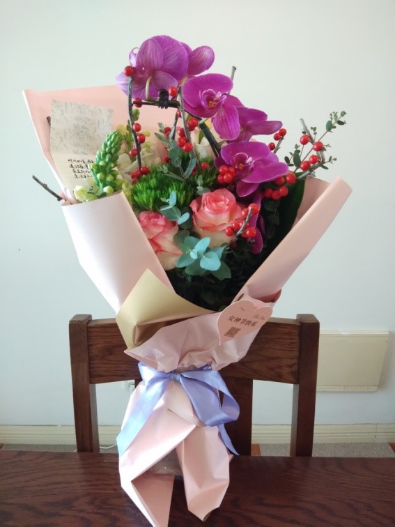 一大早,学院女教师群里热闹非凡,每位老师收到的鲜花各异,卡片内容也不尽相同,“春暖花开,送给疫情防控中最美丽的你,三月因你而美好!” 、“三月,万物复苏的季节,一切美好都将如期而至!祝你节日快乐!” 、“时代女性,风采飞扬,送给疫情防控中最美丽的你,愿你平安健康快乐!”、“你甜美的微笑,给三月带来了生机;你快乐的心情,给三月带来了活力。愿你美丽健康幸福快乐!”……一句句暖心的鼓劲话语是学院工会委员们精心为大家准备的,承载着学院工会对每位女教师的祝福。大家纷纷发来收到鲜花和卡片的好消息,并在群里秀出自己的插花作品,隔着屏幕都能感受到大家的热情高涨。更有心灵手巧的老师搭配家中不同形状的花瓶,拆分插出三瓶形态各异、风格独特的鲜花,获得无数老师的点赞。
