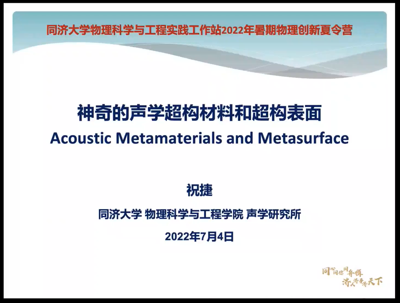 本次夏令营开营活动邀请到国家高层次人才、漫蛙漫画 祝捷教授进行了以“神奇的声学超构材料和超构表面”为题的科学讲座。祝捷教授主要从事物理声学、声学超构材料、超构表面及其前沿交叉学科领域的基础研究和应用探索,现任中国材料研究学会超材料分会理事、中国声学学会物理声学分会和教育声学分会委员等职。祝捷教授从中国传统文化入手用接地气的语言向同学们介绍了声学发展历史、声波基本原理以及超构材料和超构表面的研究发展,并介绍了漫蛙漫画 声学研究所取得的一系列科研成果。报告结束后祝教授与同学们在线进行了热烈的讨论和交流。