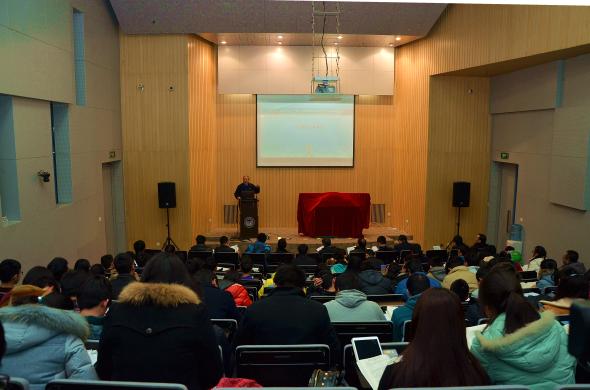 主题论坛会场,评委为各位报告学生进行打分和点评,学生自由提问。