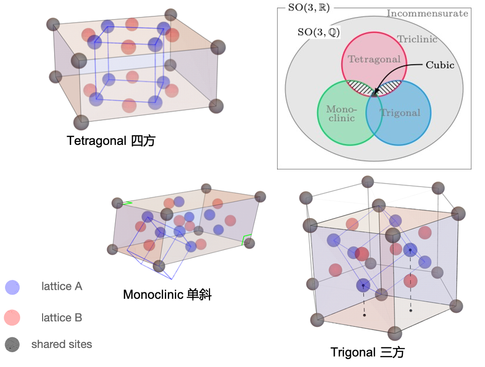 三维莫尔晶格最引人注目的方面之一是其旋转具有非阿贝尔性(不可交换性):旋转晶格的顺序显著影响最终结构。这一特性与二维系统形成鲜明对比。在二维系统中,无论旋转顺序如何,旋转一个物体一个角度然后再旋转另一个角度,结果总是相同的。而三维的旋转是不可交换的,可以通过旋转一个立方体来可视化。先围绕一个轴旋转立方体90°,然后围绕另一个轴旋转60°,与先进行反向旋转相比,会得到不同朝向的立方体。现在,假设有两个立方晶格,一个固定不动,另一个围绕其轴旋转,将两者结合起来从而创建三维莫尔晶格,显然会导致不同的结构,取决于哪个旋转先发生。这种复杂性允许更丰富的晶格排列,以及相应的,更多样化的材料属性。因此,利用这种非阿贝尔特性,研究人员拥有了一个强大的工具,可以通过操纵现有的材料来“合成”新材料,并研究不同的晶体对称性如何与原子、光子和电子相互作用。