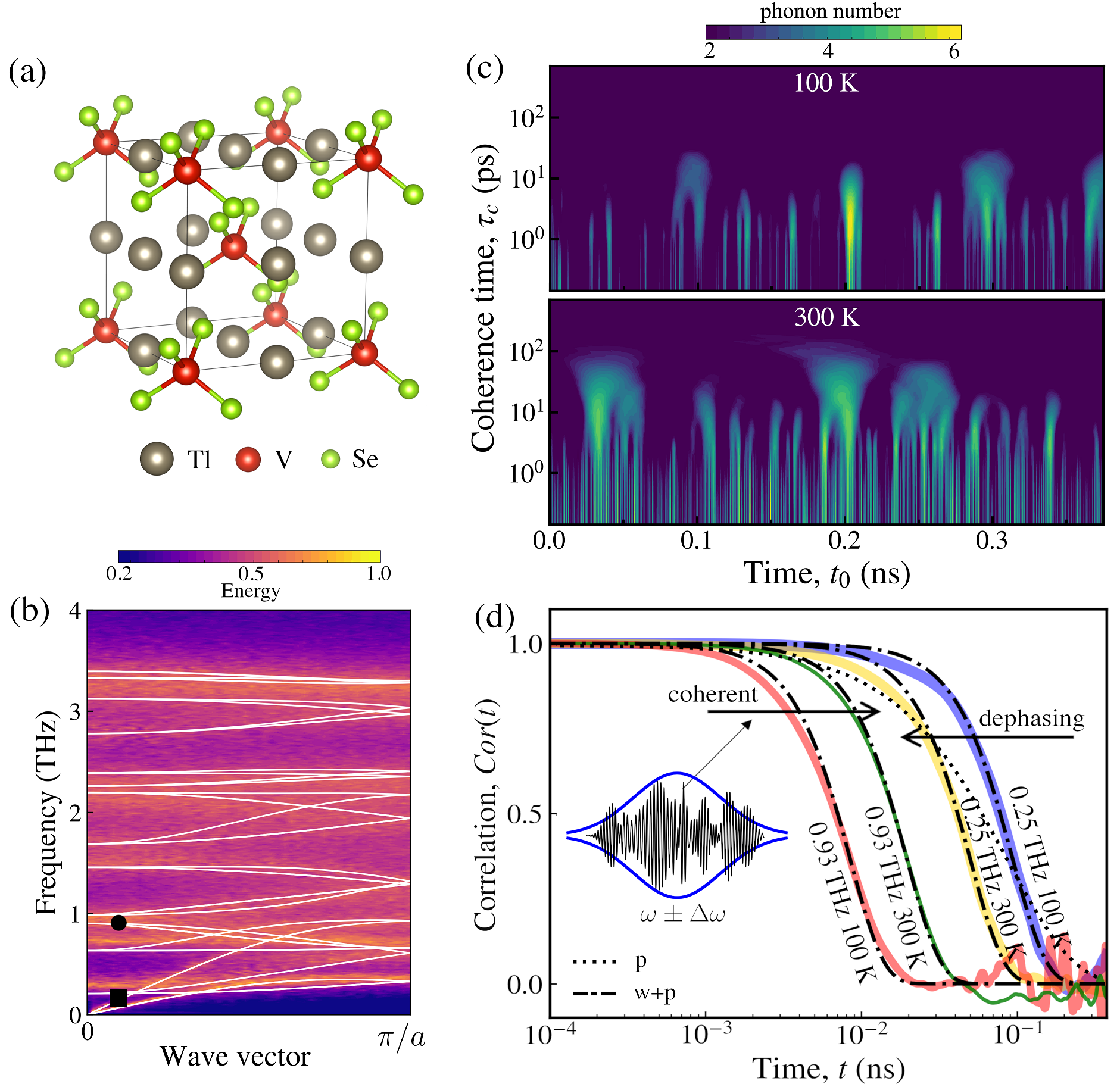图1. (a)复杂晶体Tl3VSe4结构示意图;图(b)基于晶格动力学(白线)和能量密度谱(背景色)的声子色散关系;图(c) 100K和300K下随动力学时间和相干时间变化地0.93THz模式的声子数;图(d) 100K和300K下0.25和0.93 THz模式的随相关时间变化的声子衰减。虚-点线表示的是本工作理论的拟合,点型线表示的是经典的指数衰减。