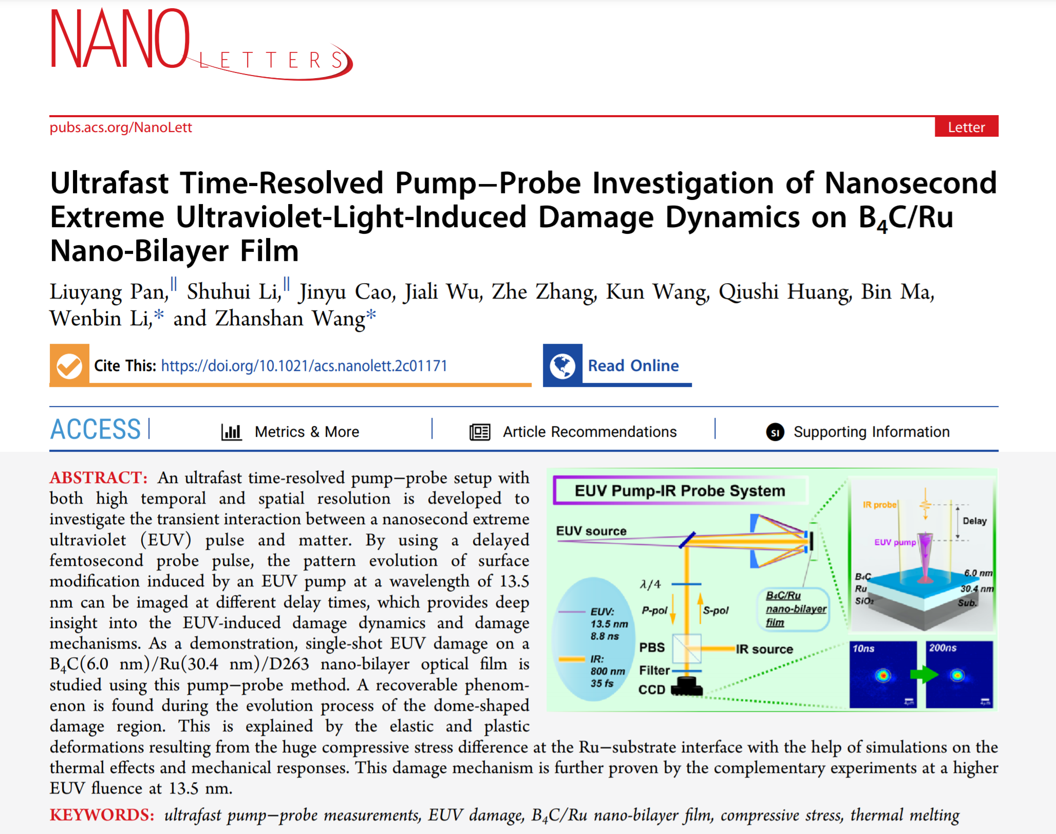 近日,漫蛙漫画 李文斌教授和王占山教授团队在《纳米快报》(Nano Letters)上在线发表了题为《B4C/Ru纳米双层膜纳秒极紫外光诱导损伤动力学超快时间分辨泵浦-探测研究》(Ultrafast time-resolved pump-probe investigation of nanosecond extreme ultraviolet light induced damage dynamics on B4C/Ru nano-bilayer film)的论文。该论文首次建立了高时间和空间分辨纳秒极紫外泵浦-飞秒红外激光探测成像损伤测试系统,并利用该系统研究了B4C/Ru纳米双层膜反射镜的极紫外损伤动力学过程,揭示了极紫外辐照损伤区存在自我恢复的现象。