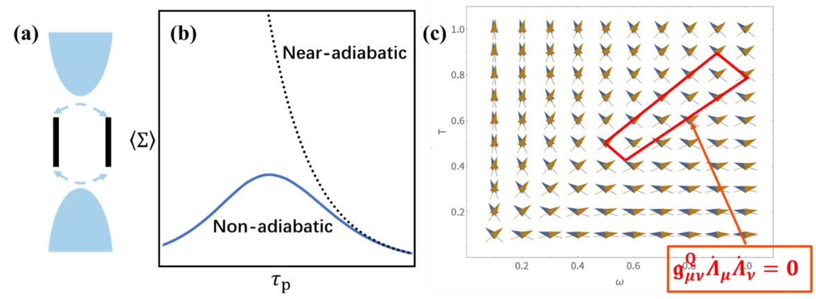 任捷教授团队的最新研究工作指出,在极缓慢驱动导致的绝热输运效应之上,还有有限速率驱动导致的非绝热输运效应。该非绝热输运效应则由时间反转对称的几何度规项描述(如图1所示),这与时间反对称的绝热几何曲率的贡献有根本不同。上述的几何流(包括非绝热的度规贡献和绝热的曲率贡献)均会对涨落定理和热力学不确定性关系产生巨大影响。该工作表明,非平衡热力学几何可以被用来描述非平衡周期驱动系统的热力学,并由此推导出一般性的热力学约束。