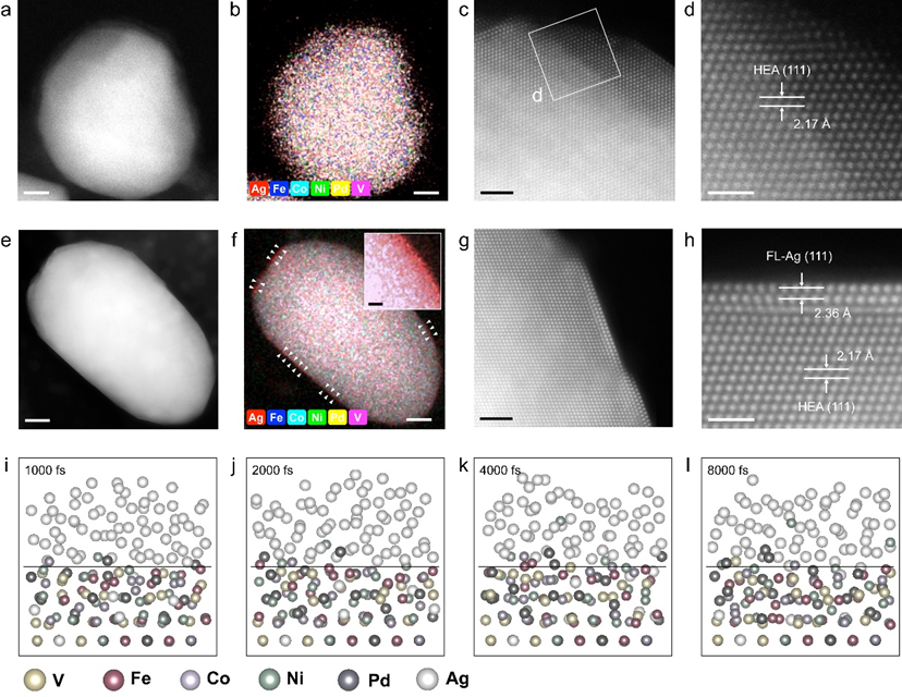 图2. 结构表征。a-d HEAhomo,和e-h 负载FL-Ag/HEA NPs的CNFs的HAADF-STEM图像、STEM-EDS 映射图像和原子分辨率HAADF-STEM图像。i-l MD模拟了1200℃下8 ps内HEA-FL-Ag界面的结构演化。红色虚线是HEA相和FL-Ag的原始分界线,蓝色的圆圈是HEA相向FL-Ag扩散的原子。